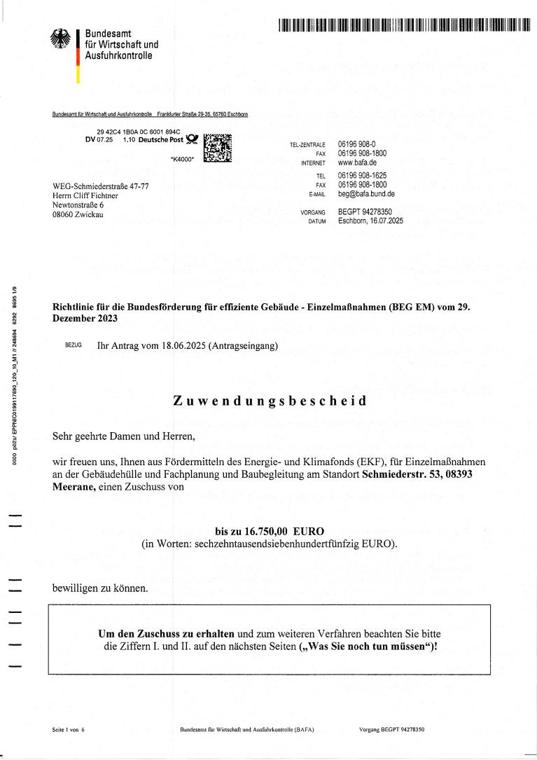 Die Untergemeinschaft Schmiederstraße 53 hat 2025 - in Anlehnung an das Haus 61 – beschlossen, das Obergeschoss mit einer zusätzlichen Dämmschicht von 4 cm auszustatten. Die hierfür entstehenden Mehrkosten von etwas mehr als 3.000 Euro ermöglichen jedoch die Beantragung von Fördermitteln beim Bundesamt für Wirtschaft und Ausfuhrkontrolle (BAFA).