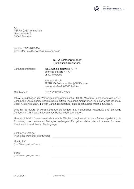 Die Eigentümergemeinschaft hat mit Beschluss 08/2022 festgelegt, dass das Hausgeld per Lastschrift eingezogen wird. Bitte füllen sie das Lastschriftformular aus und senden es an die WEG-Verwaltung zurück.