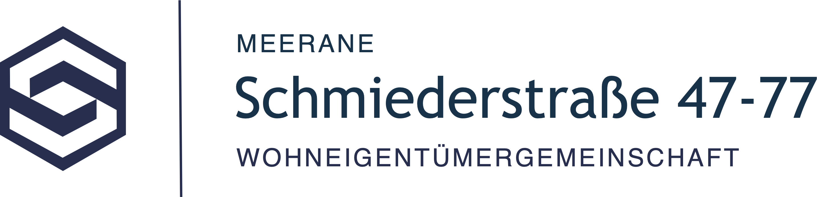 Zu einem zeitgemäßen Auftritt gehört auch ein Logo was den Zweck der Sache verkörpert und die Zusammengehörigkeit fördert. Unser Logo, entwickelt in Form eines Blocks, Carré oder Quartiers verinnerlicht den Charakter der Wohnanlage, die bekanntlich aus mehreren Häusern besteht. Je nach Betrachtung kann man den Anfangsbuchstaben "S" für Schmiederstraße erkennen. Die Worte "Meerane" und "Schmiederstraße" bezeichnen die postalische Anschrift und werden konkretisiert durch die rechtsfähige "Wohneigentümergemeinschaft".