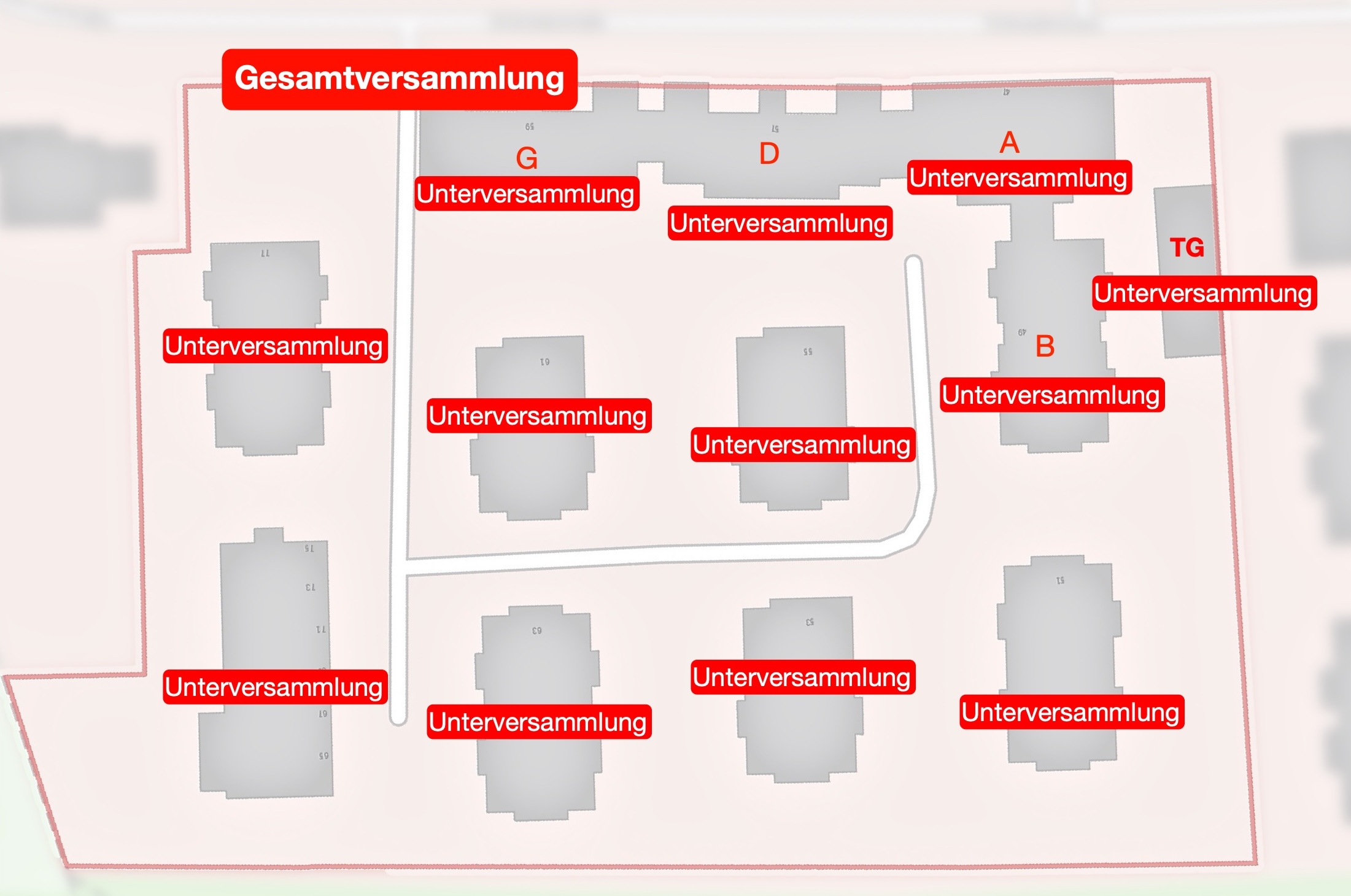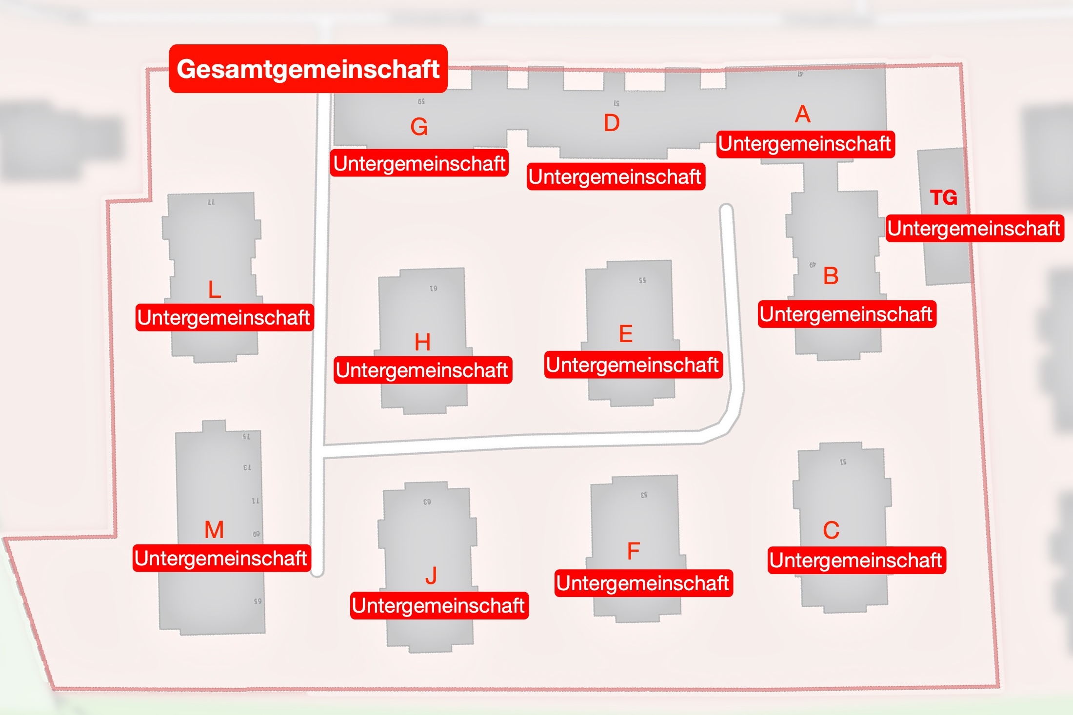 Die Gesamtgemeinschaft ist zuständig für alle Angelegenheiten, die sämtliche Wohnungseigentümer betreffen oder deren Auswirkungen sich nicht eindeutig einer der vorstehend genannten Untergemeinschaften zuordnen lassen. Hierzu gehören insbesondere die Verwaltung des Gemeinschaftseigentums im Ganzen, übergreifende bauliche Maßnahmen, wirtschaftliche Planung sowie alle Beschlussfassungen, die das Gesamtobjekt oder mehrere Untergemeinschaften gleichzeitig betreffen. Die Gesamtgemeinschaft ist räumlich durch die rot umrandeten Grundstücksgernzen definiert.